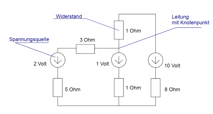 Sie besteht aus drei Spannungsquellen und vier Widerständen. Man möchte jetzt wissen, welche Ströme in den einzelnen Zweigen des Netzwerks fließen und welche Spannungen an den Widerständen abfallen. Die Kirchhoffschen Gesetze sagen jetzt aus, dass beispielsweise am bezeichneten Knotenpunkt, der mit dem 1-Ohm-Widerstnad, dem 3-Ohm-Widerstand und der Spannungsquelle von 1 Volt verbunden ist, die Ströme sich aufheben. Auch kann man beispielsweise, wenn man den Kreis 3-Ohm-Widerstand, 2-Volt-Spannungsquelle, 5-Ohm-Widerstand, 1-Ohm-Widerstand und 1-Volt-Spannungsquelle entlang wandert, die Spannungssumme letztlich zu Null wird. Zu beachten ist lediglich, dass man alle Spannungen „in Marschrichtung“ zählt. Wenn man jetzt noch das Ohmsche Gesetz (Spannung = Widerstand multipliziert mit Strom) hinzuzieht, kann man alle Spannungen und Ströme bestimmen!